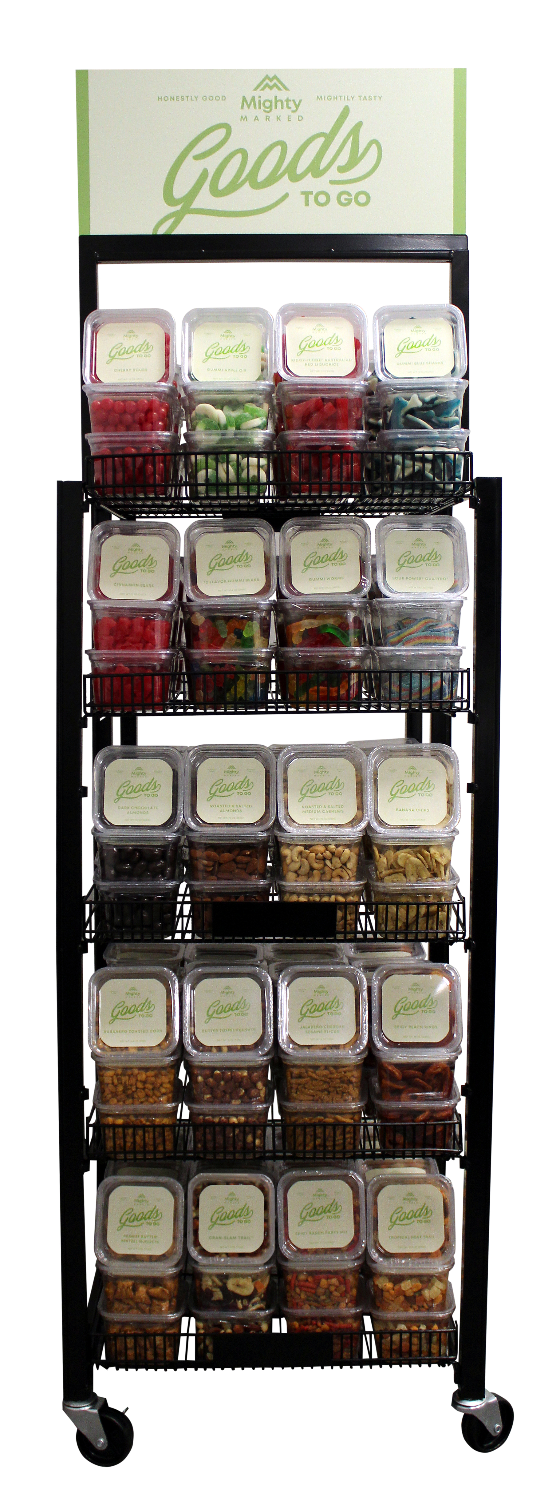Designed with input from our C-store customers, the Mighty MarkedTM retail rack is built with a slim profile on smooth-rolling caster wheels to ensure it is easy to position in limited space to maximize space allocation. The consistent branding across the Mighty MarkedTM portfolio allows retailers to build a strong and recognizable snack and candy selection, while the fresh and clean packaging design is eye-catching to drive impulse sales.
